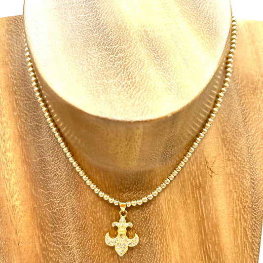 GF bead ball necklace with CZ Fleur De Lis pendant