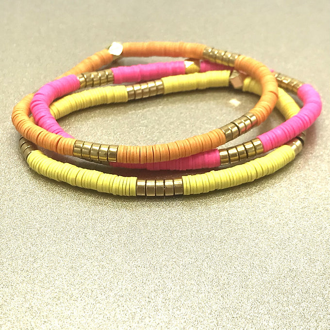 3MM Vinyl Mix bracelets are a stylish and versatile accessory that can be worn by people of all ages. Set of three bracelets.These bracelets are made from high-quality vinyl material and are available in a wide range of colors and designs. They are lightweight and comfortable to wear, making them perfect for everyday use. Mix designs allows the user to choose from various color and pattern, suitable for everyday use, party, or events. These bracelets are strung on stretch cord.