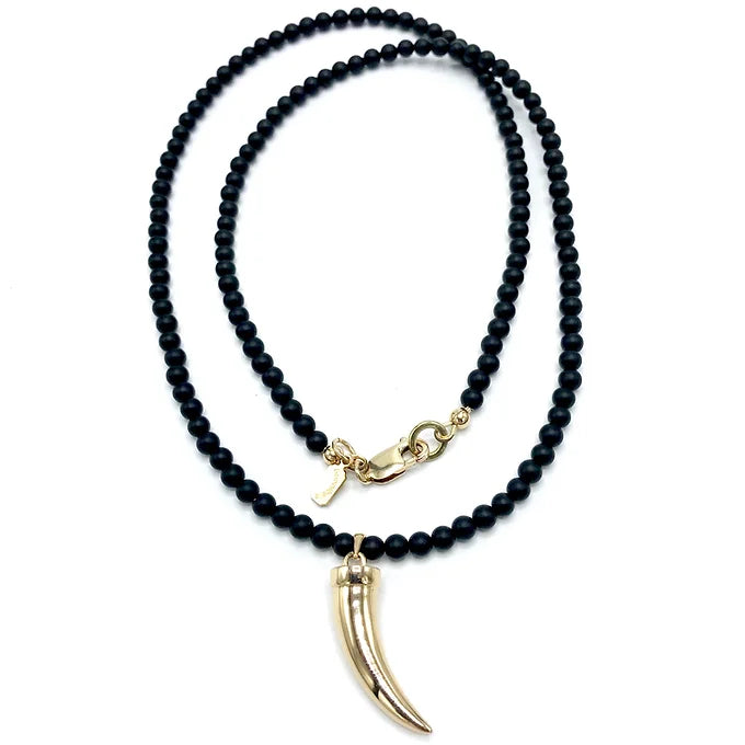 This Black Onyx and Italian Bronze Horn Necklace is a unique and stylish piece of jewelry. The necklace features a natural black onyx gemstone, and is accented with an Italian bronze horn pendant. The black onyx gemstone has a deep black color that will complement any skin tone and will look great with any outfit. The Italian bronze horn pendant adds a touch of bohemian and tribal style to the necklace. The necklace is lightweight and easy to wear, making it perfect for everyday use. This necklace is perfect for anyone who loves gemstones and bohemian style. It is suitable for any occasion and makes a great gift for yourself or a loved one. Add a touch of elegance and style to your jewelry collection with this Black Onyx and Italian Bronze Horn Necklace.