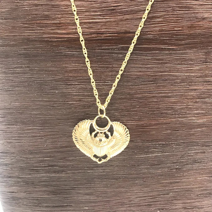 This Gold Scarab Necklace is a unique and elegant piece of jewelry. The necklace features a gold-plated scarab beetle pendant, which is strung on a delicate and high-quality 14kt gold-filled chain. The scarab beetle is an ancient symbol of rebirth, transformation and power in Egypt mythology. The gold plating of the pendant and chain gives the necklace a luxurious and high-end look. The necklace is adjustable, making it easy to get the perfect fit. It is lightweight and easy to wear, making it perfect for everyday use. This necklace is perfect for anyone who loves history, mythology and wants to add a touch of elegance to their everyday look. It is suitable for any occasion and makes a great gift for yourself or a loved one. Add a touch of elegance and style to your jewelry collection with this Gold Scarab Necklace.