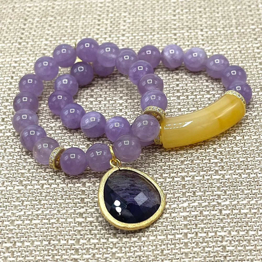 This Lavender Amethyst Bracelet Set is the perfect addition to any jewelry collection. The set includes three bracelets, each featuring a beautiful lavender amethyst gemstone set in a chic and stylish design. The lavender amethyst, known for its calming and spiritual properties, adds a pop of color to any outfit. The bracelets are stretch fit- one size fits most. Wear them all together for a bold, fashion-forward look or mix and match with other pieces for a more understated style. These bracelets are the perfect finishing touch to any outfit, whether you're dressing up for a special occasion or adding a touch of glam to your everyday look. They also make a great gift for any amethyst lover.