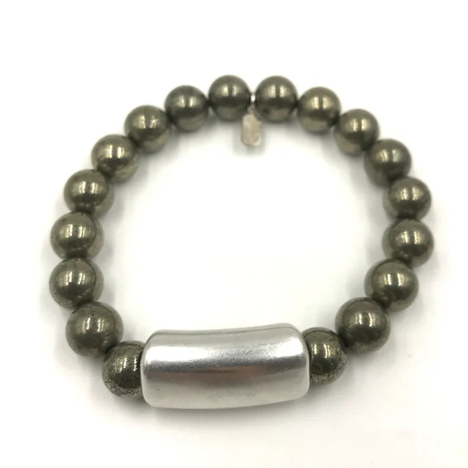 This Men's Pyrite Bar Bracelet is a unique and stylish accessory perfect for any man's wardrobe. The bracelet is made from high-quality pyrite, a natural mineral known for its iridescent metallic luster, and features a sleek bar design. The bracelet is lightweight and comfortable to wear, perfect for daily wear or special occasions. Made with stretch cord making it easy to slip on and off. Whether you're looking to add a touch of natural style to your wardrobe or give a thoughtful gift, this Men's Pyrite Bar Bracelet is sure to please.