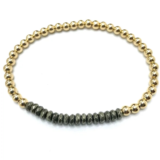 This Pyrite 4mm GF Beaded Bracelet is the perfect accessory for any fashion-conscious individual. Made from high-quality pyrite beads and strung on a durable elastic cording. This bracelet boasts a unique and striking design. The sparkling pyrite beads catch the light beautifully, making this bracelet the perfect addition to any outfit. Whether you're dressing up or down, this bracelet is sure to make a statement. Perfect for any occasion, this bracelet makes a great gift for yourself or a loved one. Add this elegant and unique piece to your jewelry collection today!