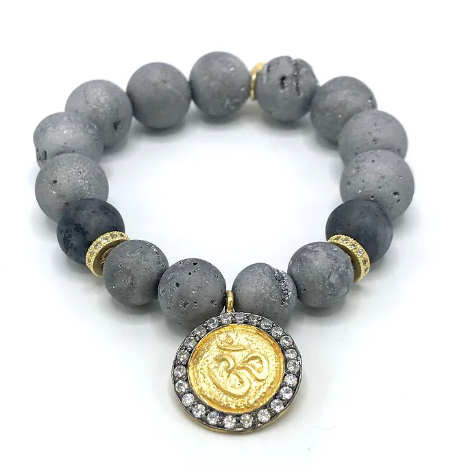 This Silver Druzy and Ohm Bracelet is a unique and elegant piece of jewelry. The bracelet features a natural druzy stone set in a silver-plated Ohm charm. The druzy stone has a sparkling surface that adds a touch of glamour to the bracelet. The Ohm symbol is a sacred sound and a spiritual symbol in Hinduism, Buddhism, Jainism and Sikhism, it represents the sound of the universe and is believed to have a calming and meditative effect.. stretch fit- one size fits most. It is lightweight and easy to wear, making it perfect for everyday use. This bracelet is perfect for anyone who loves natural gemstones and spiritual symbols. It is suitable for any occasion and makes a great gift for yourself or a loved one. Add a touch of elegance and style to your jewelry collection with this Silver Druzy and Ohm Bracelet.